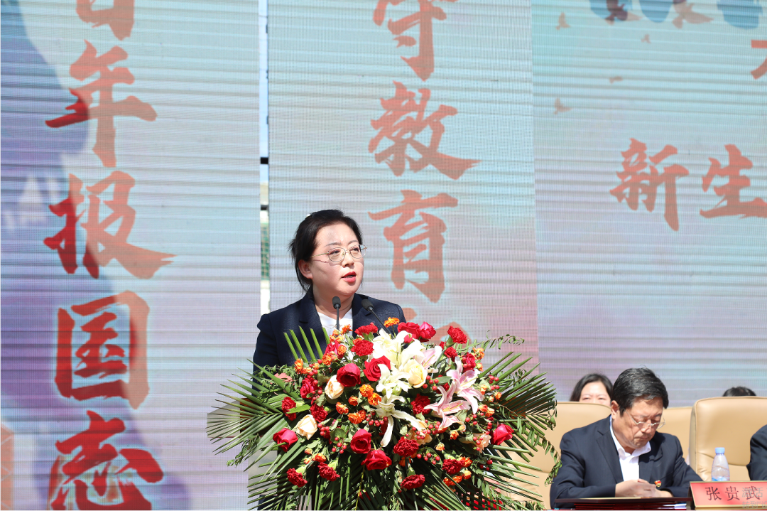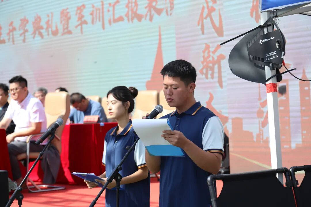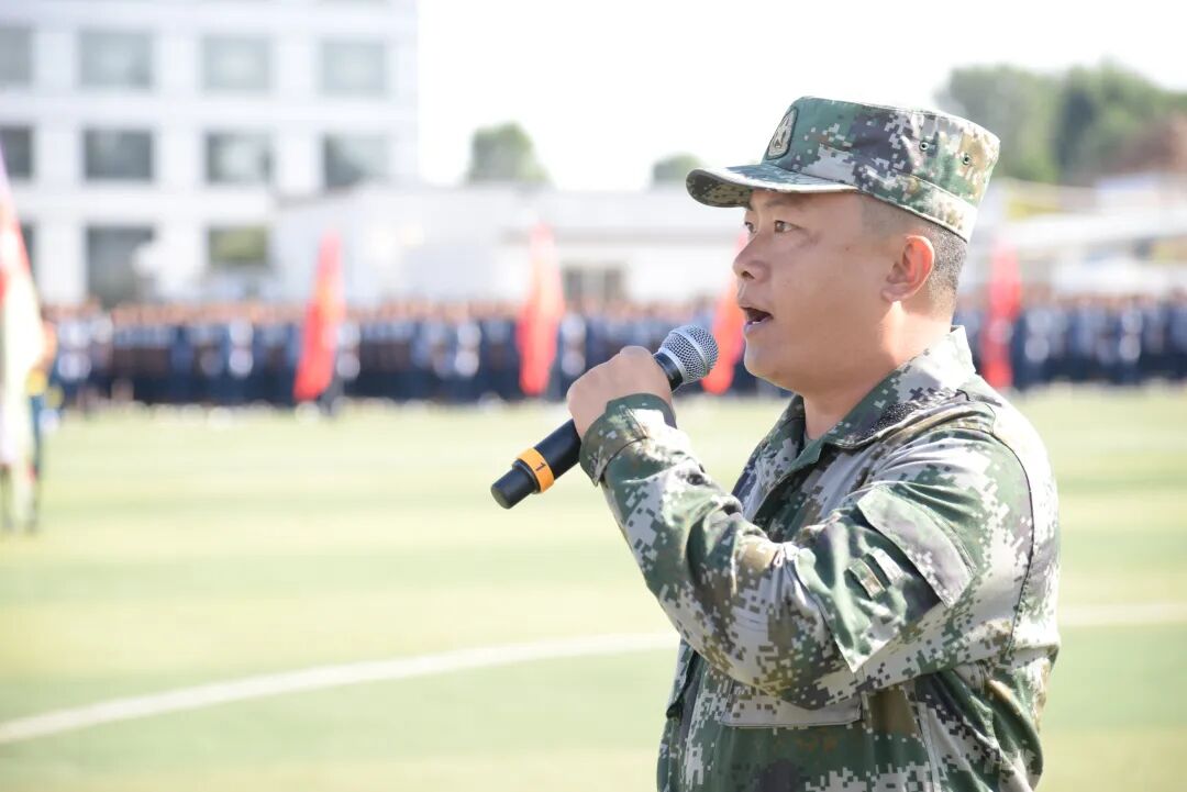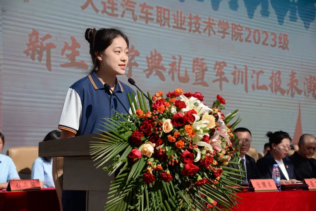 新生代表赵紫月回忆军训期间喊过的口号,打过的军体拳,站过的军姿,立志要继续发扬军训优良作风,刻苦学习,锐意进取,号召全体同学不断强大自己、丰富自己、完善自己,以百折不挠的意志、矢志不移的决心,锤炼强大的心性,赢得命运的青睐,成就更好的自己。谁说女子不如男,赵紫月倡导全体女生在军训中展示风采,以军人的气质、军人的魄力、军人的精神刻苦训,勇往直前,呼吁全体新生以“青春之我”与时代浪潮“同频共振”,同向而行。