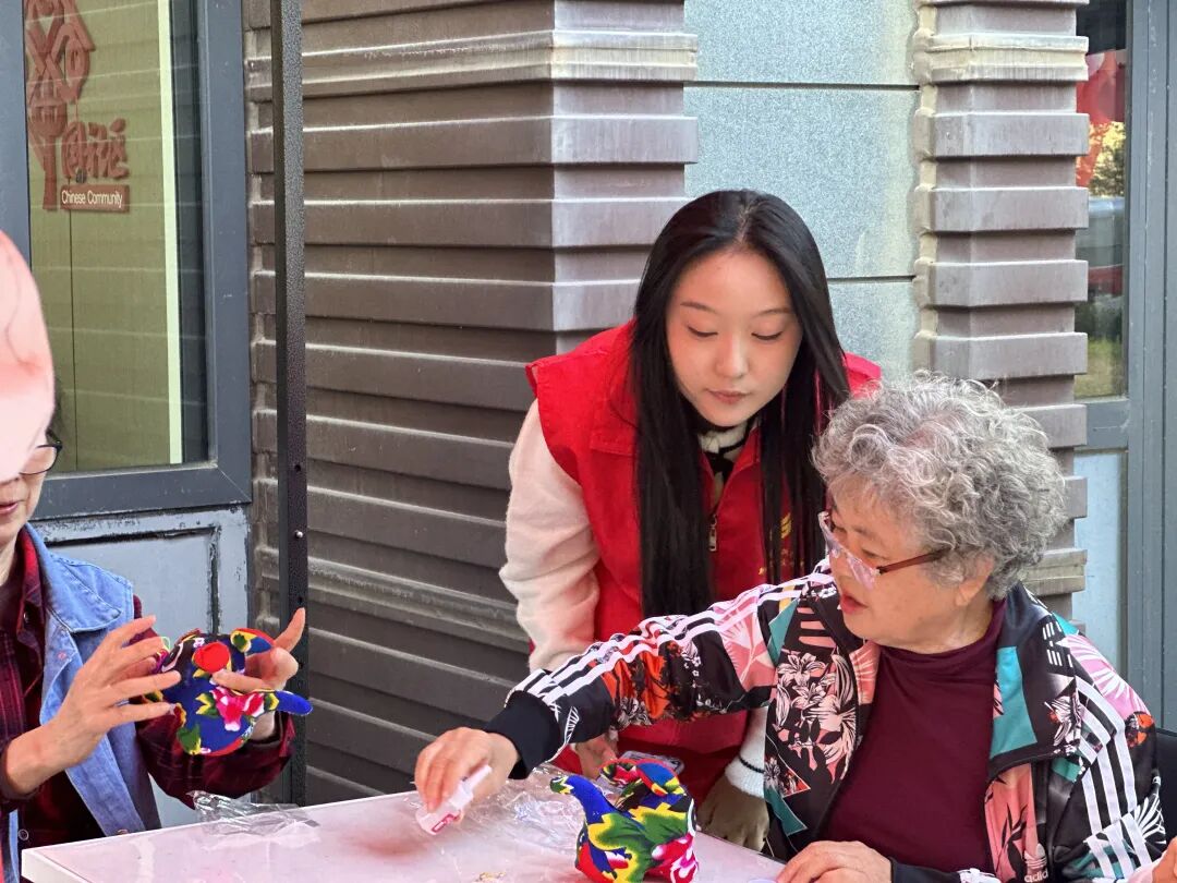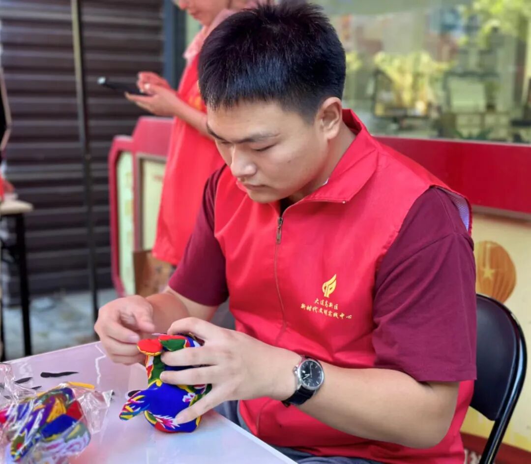 坊主和志愿者现场教学,同学们和社区居民一起拼合出颜色亮丽、憨态可掬布老虎,让传统手工艺焕发出新的生命力。